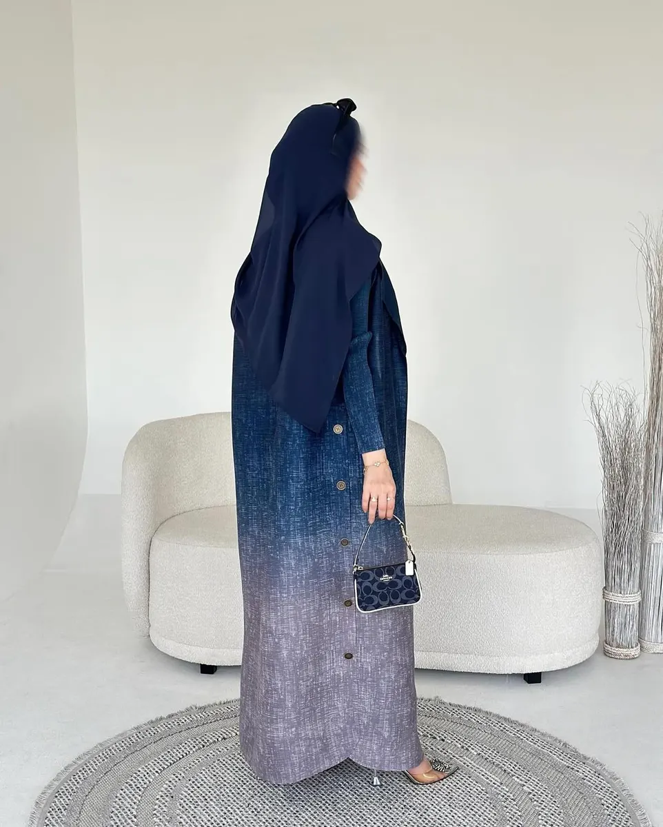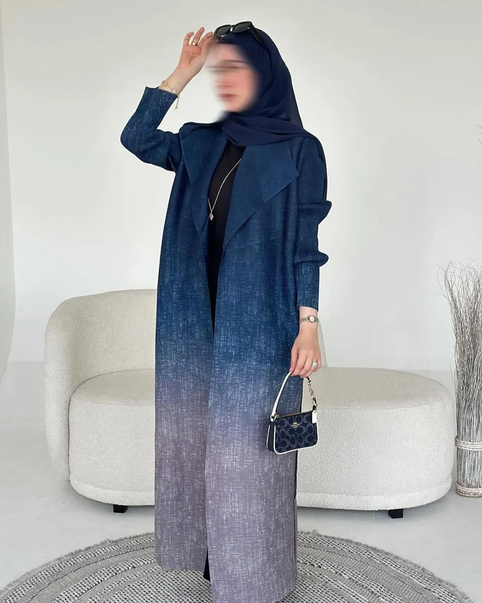 Modern open abaya in deep navy fading into soft grey ombre with a structured collar and optional belt for a sleek elegant silhouette.