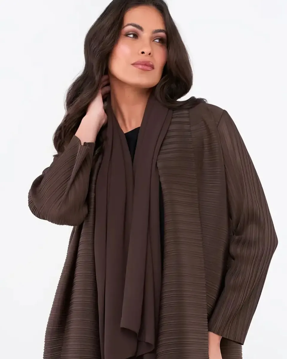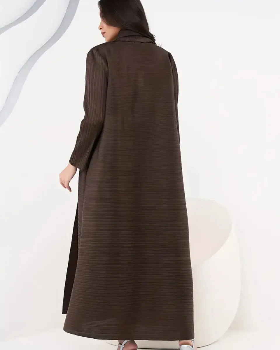 Sophisticated deep brown pleated abaya with a flowing structured drape, crafted for an elegant and polished modern look.