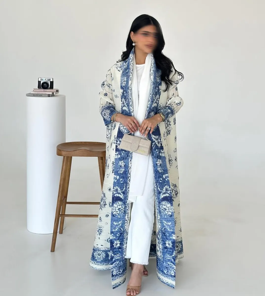 Cream abaya with elegant blue porcelain-inspired floral prints and statement borders for a refined artistic look.