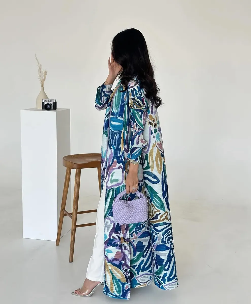Vibrant full-length open abaya featuring a bold tropical floral print in shades of blue, teal, lilac, and soft green for a fresh statement look.