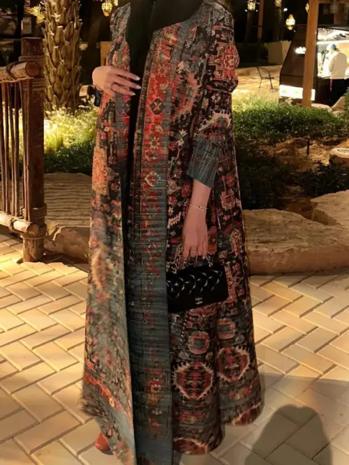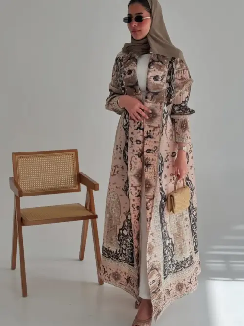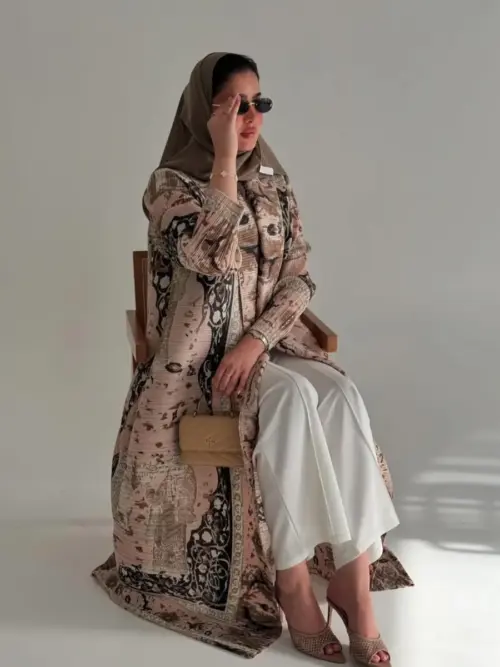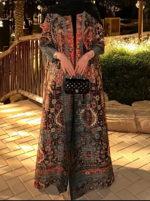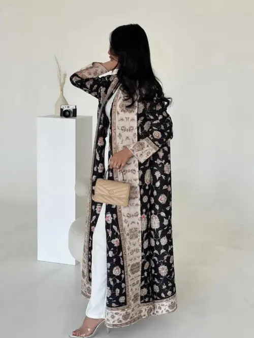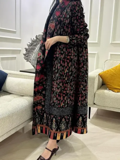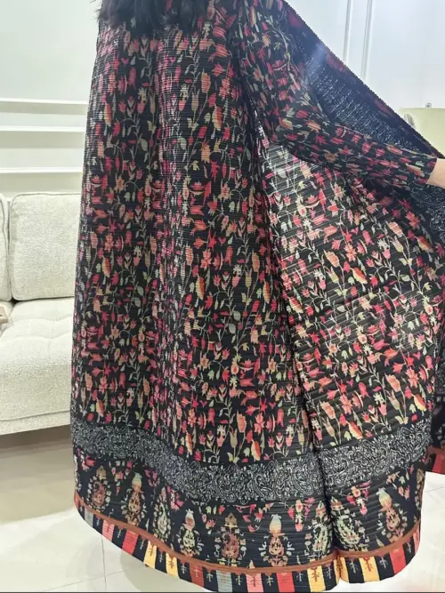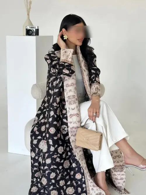 Elegant pleated abaya featuring a smoky black to fuchsia ombre gradient with a dramatic flowing silhouette for a bold refined statement look.