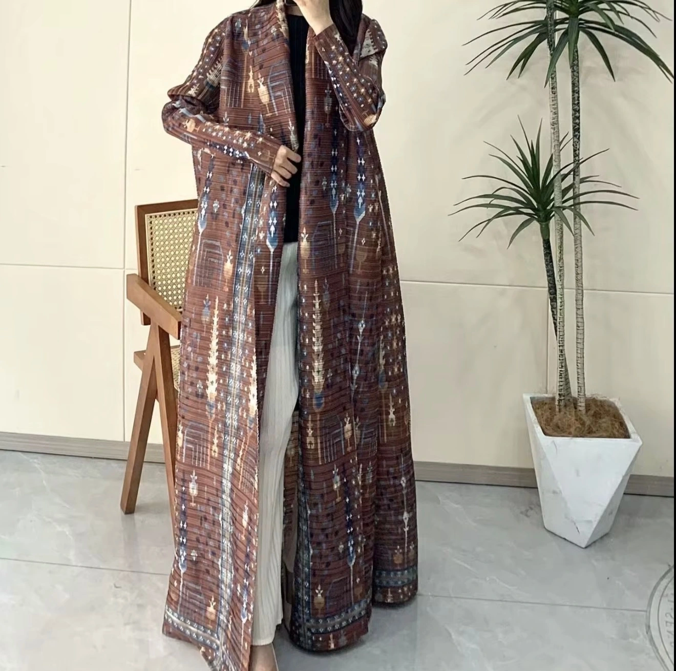 Elegant black pinstripe abaya with structured lapel collar, double-breasted buttons, and contrast cuff detailing for a modern refined look