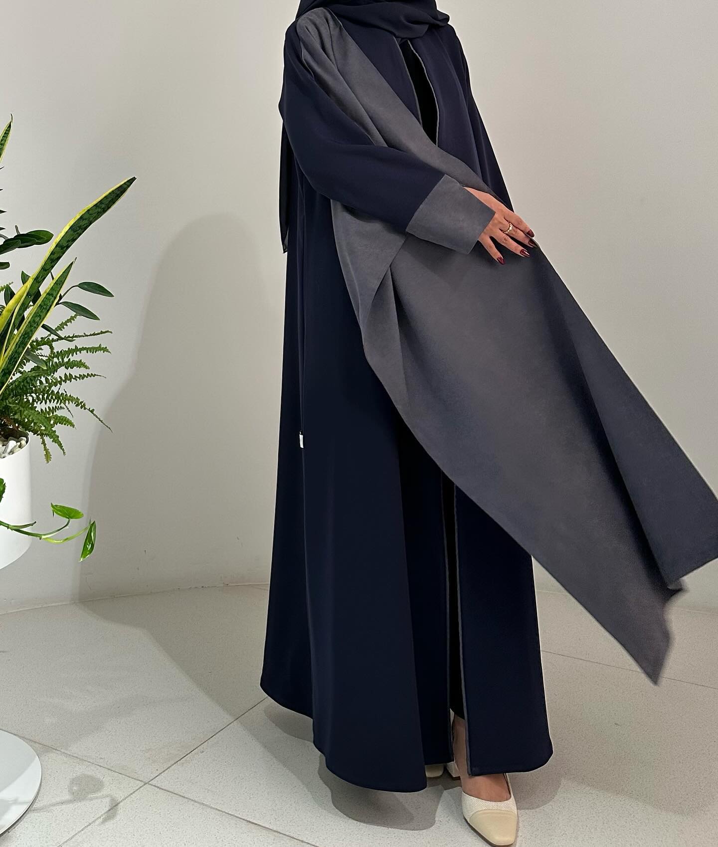 Elegant navy abaya paired with a flowing grey cape overlay, creating a sophisticated layered look with graceful movement and modern contrast.